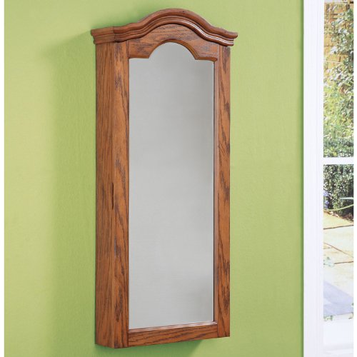 Wall mirror features stepped arch crown frame and storage. Door swings open with recess handle to reveal an interior with two rows of seven necklace hooks and one accessory/cosmetic shelf. Back side of door has ring pads and bauble hangers. Finished in distressed "Antique Oak" with Black lining. Fully assembled. Read more...