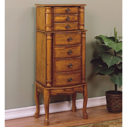 This traditional Jewelry Armoire incorporates a Scandinavian woodlands theme to identify itself as a charismatic bedroom fixture. Distinguished by its chest-on-chest resemblance, half-column posts and Queen Anne style legs, the Woodland exudes a rustic sophistication. Five drawers and one curved door cabinets provide considerable storage capacity, and a flip-top oval mirror with sunken tray is an added feature. A woodland oak finish with golden oak veneers completes this attractive armoire's look and appeal. Features: Jewelry Armoire features solid rubberwood and MDF construction with select oak veneers 3 small curved drawers, 2 large curved drawers, and 1 curved door cabinet First small drawer has 9 squares and all other drawers are opened and fully lined in 100% plush black rayon Flip-top oval mirror with tray Side doors open 90176; Side cabinets features two rows each of necklace hooks Attractive detailing Specifications: Closed dimensions: 40.25" H x 15.75" W x 11" D Open dimensions: 50.5" H x 30.75" W x 11.75" D Shipping Carton Dimensions: 19.5" H x 14.5" W x 26" D Weight: 51 lbs Some Assembly Required Manufacturer Limited 1-Year Warranty Against Manufacturing Defects Read more...