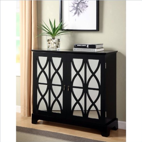 The Black Console with Mirrored Glass Doors adds a fun and decorative element to any room. Two doors open up with decorative pulls to provide hidden storage. The sturdy build and flat top provide the perfect space to display your treasures. The glass mirrored doors provided an extra touch of uniqueness and are accented by a funky curved pattern. The black wood is sure to fit into any decor. Doors assembly required. Read more...
